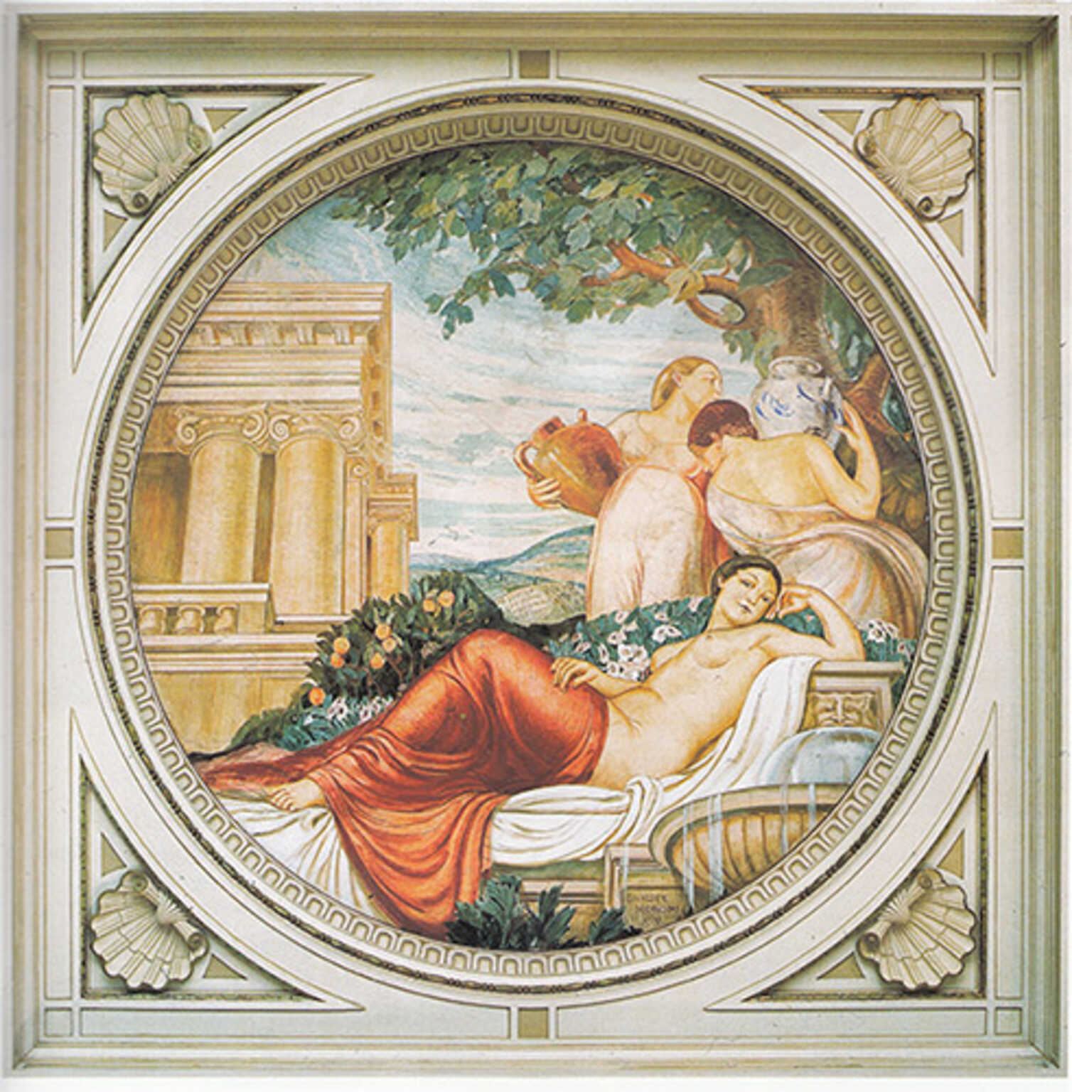 Nel 1922 Giuseppe Moroni ricevette l’incarico di dipingere sulla controfacciata delle Terme Berzieri di Salsomaggiore un racconto allegorico in tre riquadri. Il soggetto, il bagno di Igea, è inserito in un raffinato corteo di ancelle mesopotamiche e di animali esotici. E proprio per il volto di Igea il pittore ebbe come modella l’allora diciannovenne Maria Stella Turchetti che divenne la compagna della sua vita e che, successivamente, fu ritratta in innumerevoli quadri.
