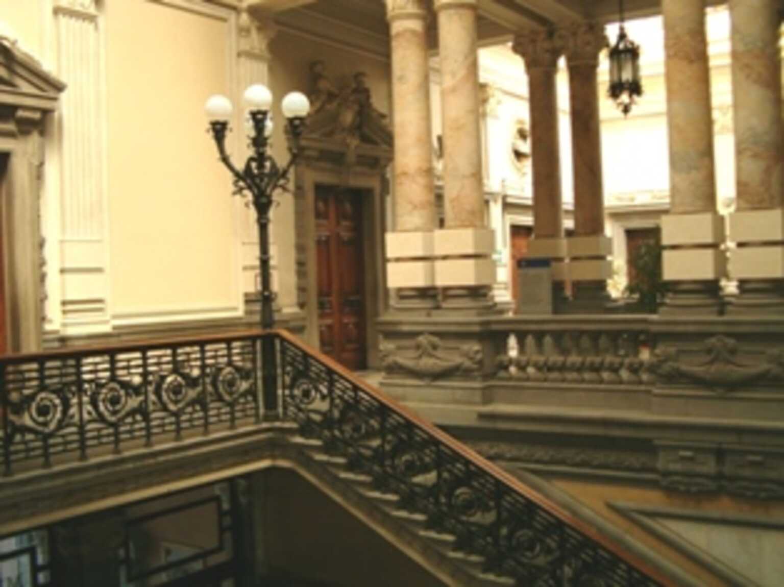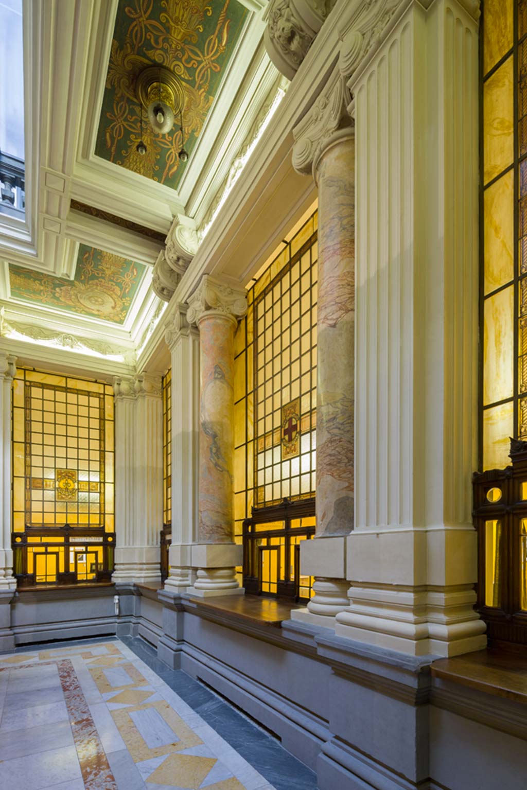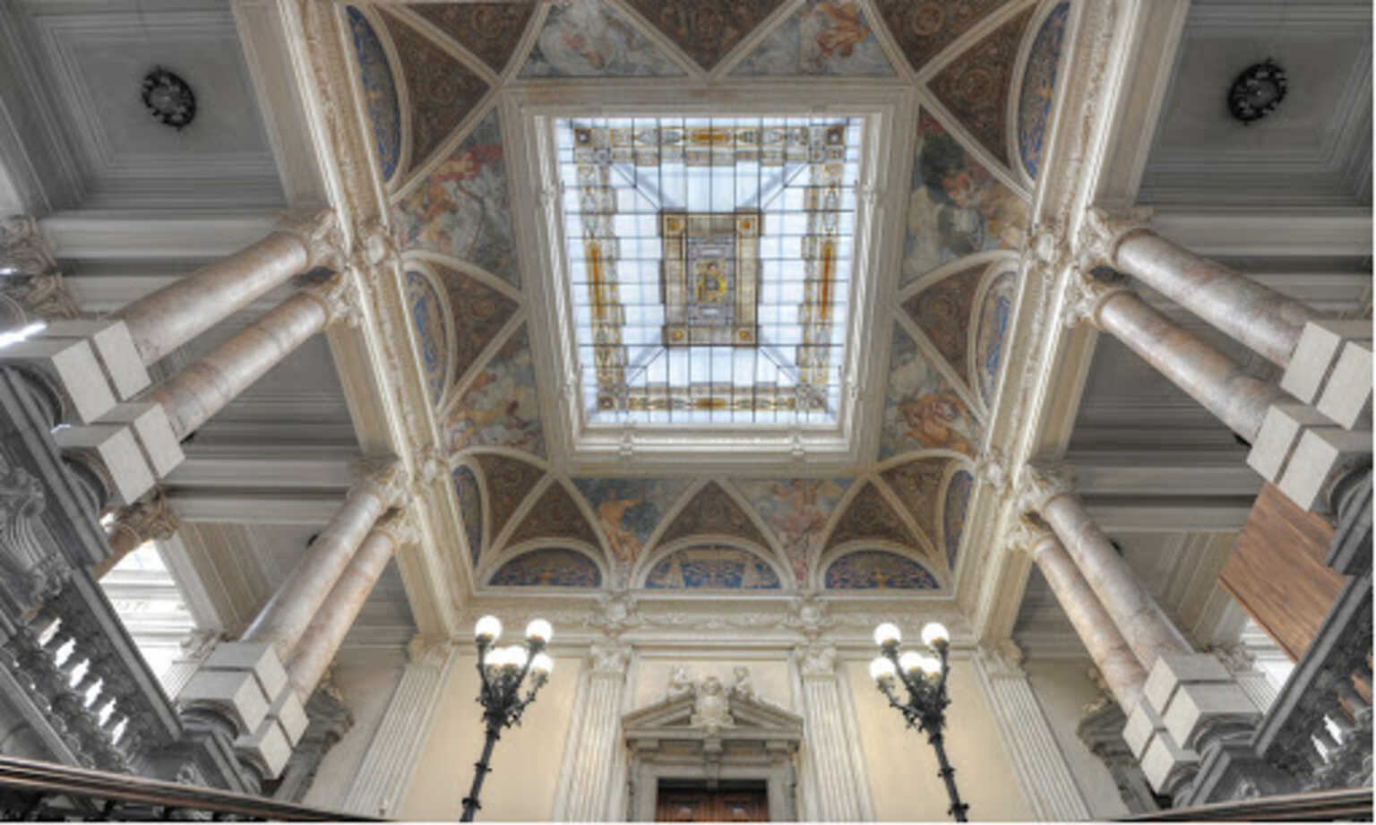 Incisa su ogni lato della trabeazione sottostante lo splendido velario centrale, un’altra iscrizione: OPERA COMPIUTA NELL'ANNO 1918 - L'ANTICO FU IL NUOVO E IL NUOVO L'ANTICO esalta la modernità del palazzo declinata con gli stilemi del buon tempo antico.